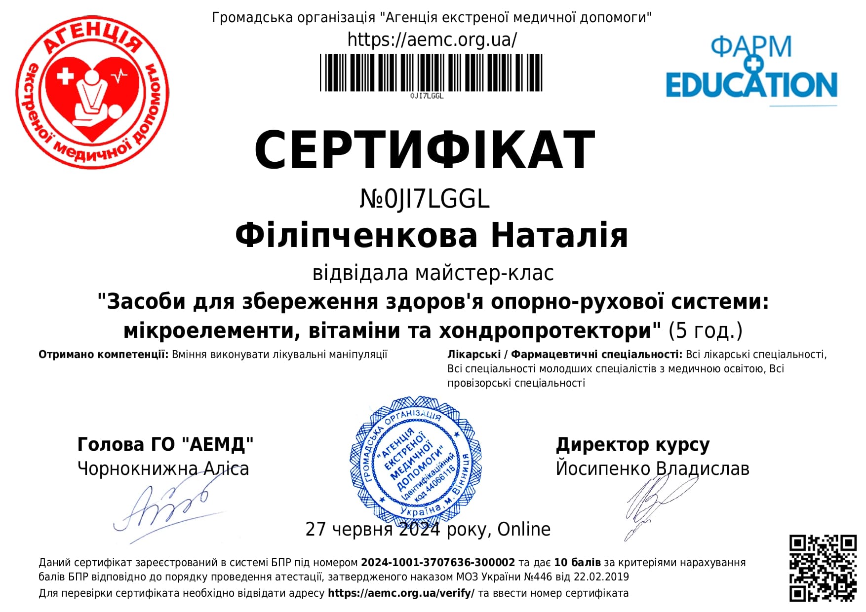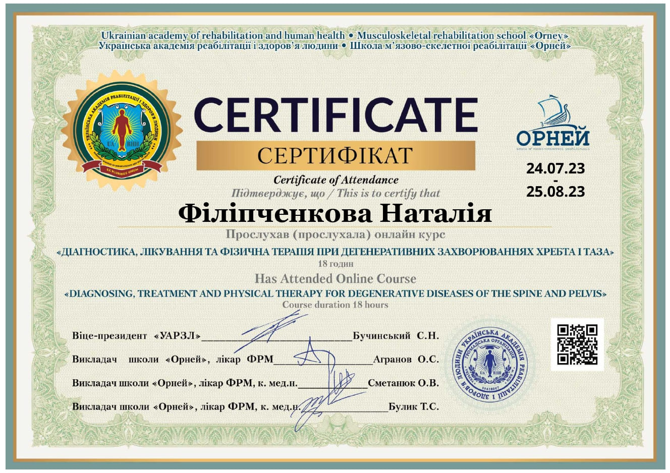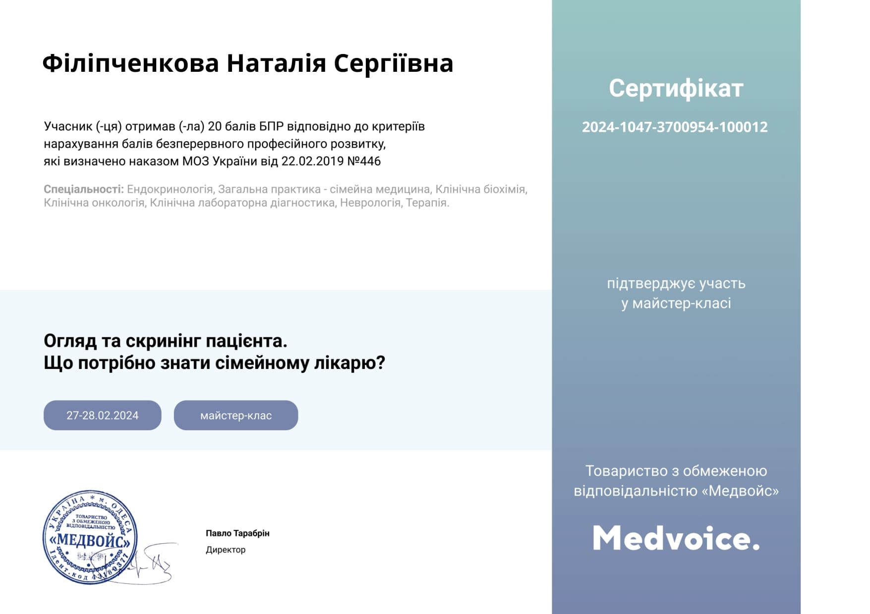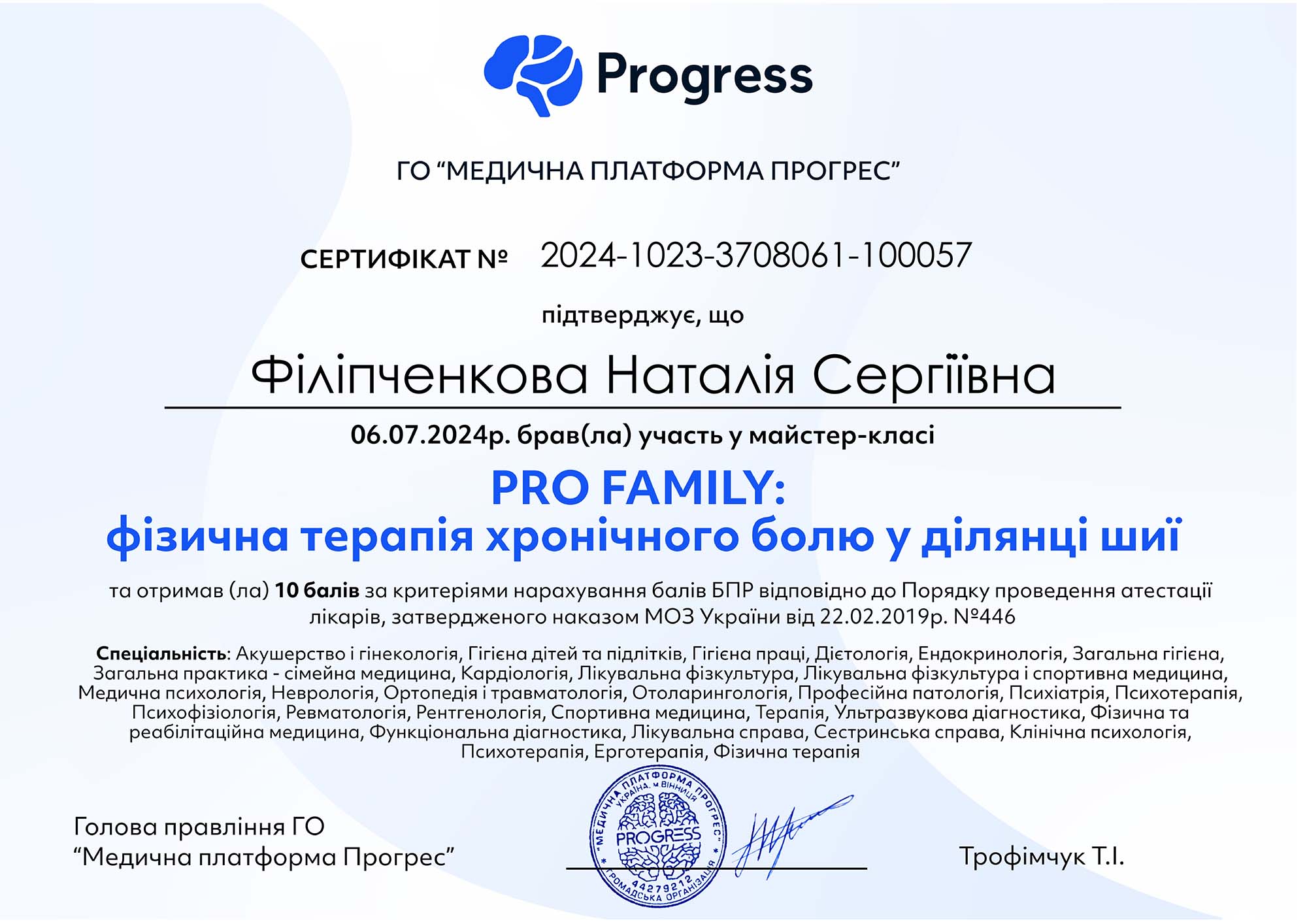 Квалификация: «Врач общей практики – семейный врач», «Врач физической и реабилитационной медицины»